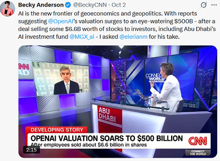 Sulle operazioni finanziarie opache di Open AI e compagnia cantante, noi abbiamo già scritto qui nel Blog il 28 settembre, e successivamente più di una volta alla pagina TWIT - TWOO. Oggi non c’è lo spazio, non c’è il tempo, e non c’è la voglia: però ci ritorneremo, in un prossimo futuro.
